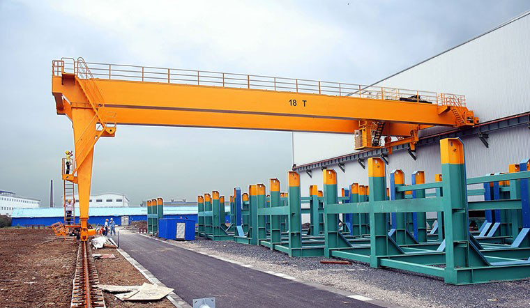 半門式起重機:分箱式和桁架兩種是按機械工業(yè)部標準JB/T5663-91設計制造的。他與CD1、MD1等型式電動葫蘆配套使用,成為一種地面軌道運行、裝上支腿及有懸臂的起重機,為了方便用戶,設有地面(有線加遙控)和操縱室兩種操縱形式。操縱室又設有閉式及后面或側面開門兩種形式,以供用戶選擇。大車運行采用分別驅動形式,驅制動有兩種方式,一種是靠錐形電動機來完成,傳動是采用“一開一閉”式齒輪轉動,其閉式齒輪部分是借用LD型單梁起重機運行的減速機;一種是車輪帶有滾動軸承的角形軸承箱組裝,驅動用鼠籠型或繞線型電動機、ZSC型立式減速機及電磁或液壓制動器來完成。